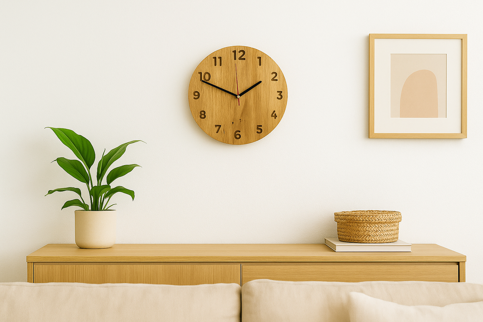 Handgefertigte Wanduhr aus massivem Eichenholz – zeitloses Design, ruhig, langlebig.